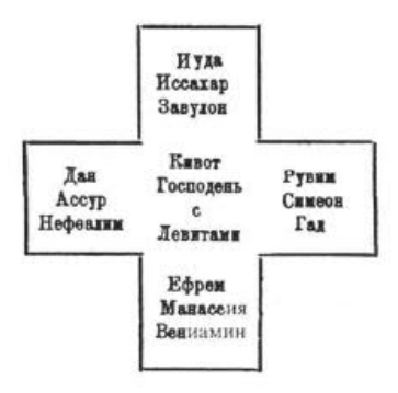г) Расположение полков израильских в пустыне на четыре части служило также прообразованием креста четвероконечного следующим образом: в середине ополчения стояла сень свидения с кивотом Завета, и тут же находилось племя Левиино, служившее скинии. Напереди, с востока, расположены были три полка: Иудин, Иссахаров и Завулонов; сзади, от запада, – тоже три полка: Ефремов, Манассиин и Вениаминов. На правой стороне, от юга, – три полка: Рувимов, Симеонов и Гадов. На левой стороне, от севера, – три: Данов, Ассуров и Неффалимов. Таким образом, ополчение израильтян в пустыне было крестообразное10. Об этом прообразовании упоминается и в каноне Воздвиженском, в песне четвертой, стихире третьей: «Священно ополчаются четверочастнии людие предходяще образом свидетельства скинии, крестообразными чинми прославляемии».
