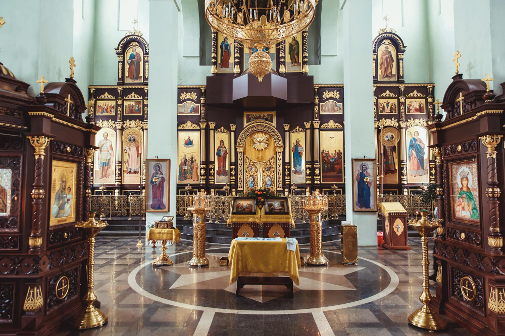 教堂内部圣堂是教堂的主体部分,用一张被称为圣像屏风(圣像壁)的带有通道的圣像屏帏与至圣所(圣坛)隔离开来。圣所的围墙上都装饰有圣像和壁画,很多的前面都挂有点着了的灯(灯台)。东正教教堂尤其值得注意的是在传统的东正教教堂里没有一张教堂内的靠背长凳。教堂里的教父认为在进行着神圣的仪式时坐着是失礼的(除了在某些特殊的场合如教育和唱圣歌),而且空地更有利于更多信徒们做象征性的东正教礼拜的鞠躬和叩拜动作。在教堂的最东端是圣坛(或至圣所),分两个房间-圣器收藏室和小礼拜室在圣坛的两边,这两个房间用圣像屏风与圣坛隔开来。