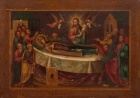 Киево-Печерская икона Успения Пресвятой Богородицы - одна из древнейших явленных икон в Русской Православной Церкви. Пресвятая Богородица вручила ее 4-м византийским зодчим, которые в 1073 году принесли икону преподобным Антонию и Феодосию Печерским. Зодчие пришли в пещеру к преподобным и спросили: "Где хотите вы начать церковь?" Святые ответили: "Идите, Господь назначит место". - "Как вы, предсказывая себе скорую смерть, не назначили еще места? - удивились зодчие. - А еще дали нам столько золота". Тогда преподобные призвали всю братию и стали расспрашивать греков, говоря: "Скажите нам истину, кто вас послал и как вы попали сюда?". Зодчие стали рассказывать: "Однажды, когда мы спали в своих домах, рано, на восходе солнца, пришли к каждому из нас благообразные юноши и сказали: "Зовет вас Царица во Влахерну". Мы пришли все в одно время и, расспросивши друг друга, узнали, что ту же речь Царицы слышал каждый из нас и одни и те же посланные были за всеми нами. Наконец, мы увидели Царицу со множеством воинов. Мы поклонились Ей, и Она сказала: "Я хочу построить Себе Церковь на Руси, в Киеве, и вот, велю вам это сделать. Возьмите золота на 3 года". - Мы же, поклонившись, спросили: "Госпожа, Царица! Ты посылаешь нас в чужую страну, к кому мы там придем?" - Она отвечала: "Я посылаю вас вот с ними, с Антонием и Феодосием". - Мы удивились: "Зачем же, Госпожа, Ты даешь нам золота на 3 года? Им и прикажи заботиться о нас, что нам есть и что пить, и нас одаришь, чем Сама знаешь". - Царица возразила: "Этот, Антоний, только благословит и отойдет от этого света в вечный покой. А этот, Феодосий, отойдет после него через 2 года. Итак, берите золота до избытка. А что до того, чтобы почтить вас, то никто не может сделать это так, как Я. Дам вам, чего и ухо не слышало, и глаз не видел и что на сердце человеку не всходило. Я Сама приду смотреть Церковь и буду в ней жить". - Она дала нам также мощи святых мучеников: Артемия, Полиевкта, Леонтия, Акакия, Арефы, Иакова, Феодора - и сказала: "Это положите в основание". - Мы взяли золота больше, чем нам нужно было, и Она сказала: "Выйдите на двор, посмотрите величину Церкви". - Мы вышли и увидели Церковь на воздухе. Вошедши опять к Царице, мы поклонились и сказали: "Госпожа Царица, какое имя Церкви?" - Она ответила: "Я хочу назвать ее Своим Именем". - Мы не смели спросить, как Ее Имя, но Она опять сказала Сама: "Богородицына будет Церковь". - И, давши нам эту икону, сказала: "Она будет в ней наместной". Мы поклонились Ей и пошли в свои дома, неся с собой икону, полученную из рук Царицы". Выслушав это, все прославили Бога, и преподобный Антоний сказал: "Дети, мы никогда не выходили из этого места. Звавшие вас благообразные юноши были святые Ангелы, а Царица во Влахерне - Сама Пресвятая Богородица. А что до нашего образа и данного как бы через нас золота, то Господь ведает, как Он изволил сотворить это со Своими рабами. Благословен приход ваш, добрую спутницу вы имеете, честную икону Госпожи". Три дня молился преподобный Антоний, чтобы Господь Сам указал ему место для церкви. После первой ночи по всей земле была роса, а на святом месте сухо. На другое утро по всей земле было сухо, а на святом месте роса. На третье утро, помолившись, благословили место и измерили золотым поясом ширину и длину церкви. (Этот пояс еще давно принес варяг Шимон, которому было видение о постройке церкви.) Огонь, спадший с не