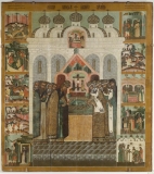 Перевод: В сей день прибегнем, верные, к Божественней и цельбоносной ризе Спасителя нашего Бога, благоволившего ее на теле Своем носить и на Кресте святую Свою Кровь излить, которою искупил нас от рабства врагу. Потому с благодарностью взываем Ему: «Спаси Отечество наше, и архиереев, и град, и всех людей священной Твоею ризою защити и спаси души наши, как Человеколюбец!»