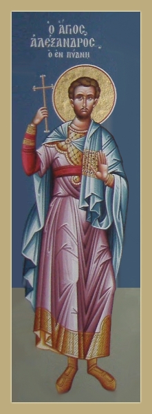Святой мученик Александр был пресвитером в городе Пидне, недалеко от Солуни. Своей проповедью святой обратил многих язычников в христианство. Во время гонений на христиан при императоре Максимиане Галерии (305-311) святой Александр был подвергнут жестоким истязаниям, а затем обезглавлен.