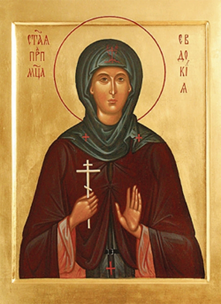 О, свята́я уго́днице Бо́жия, преподобному́ченице Евдоки́е! По́двигом до́брым подвиза́вшися на земли́, восприя́ла еси́ на Небесе́х вене́ц пра́вды, его́же угото́вал есть Госпо́дь всем лю́бящим Его́. Те́мже взира́юще на святы́й твой о́браз, ра́дуемся о пресла́внем сконча́нии жи́тельства твоего́ и чтим святу́ю па́мять твою́. Ты же, предстоя́ Престо́лу Бо́жию, приими́ моле́ния на́ша и ко Всеми́лостивому Бо́гу принеси́, о е́же прости́ти нам вся́кое прегреше́ние и помощи́ нам ста́ти проти́ву ко́знем диа́вольским, да изба́вльшеся от скорбе́й, боле́зней, бед и напа́стей и вся́каго зла, благоче́стно и пра́ведно поживе́м в ны́нешнем ве́це и сподо́бимся предста́тельством твои́м, а́ще и недосто́йни есмы́, ви́дети блага́я на земли́ живы́х, сла́вяще Еди́наго во святы́х Свои́х сла́вимаго Бо́га, Отца́ и Сы́на и Свята́го Ду́ха, ны́не и во ве́ки веко́в. Ами́нь.