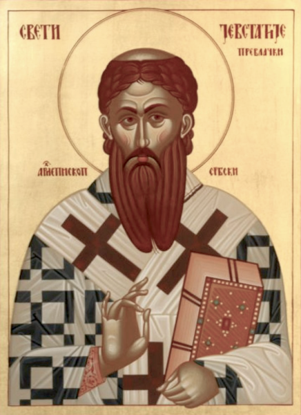 Свт. Евстафий, архиепископ Сербский (XIII век), родился в благочестивой семье, принял монашество в монастыре Архангела Михаила в Черногории. Совершил паломничество в Иерусалим и на Афон, где стал игуменом Хиландарского монастыря. Позже рукоположен во епископа Зетской епархии, а затем избран архиепископом Сербским. Управлял Церковью семь лет, прославился подвижничеством. Скончался около 1285 года. Мощи перенесены в Печский собор.