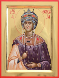 Праведная царица Феодора была супругой греческого царя Феофила-иконоборца (829–842), но не разделяла ереси мужа и тайно почитала святые иконы. После его смерти, когда святая Феодора управляла государством вместо малолетнего сына Михаила, она восстановила иконопочитание, возвратила низложенного святого патриарха Мефодия и созвала Собор, на котором иконоборцы были преданы проклятию. Ею установлено празднование этого события – Торжество Православия, которое ежегодно совершается в первое воскресенье Великого поста.