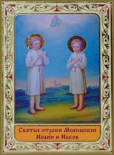 Святые Иоанн и Иаков, отроки Менюжские, были дети благочестивых родителей – Исидора и Варвары, занимавшихся землепашеством в одном из селений Медведского погоста Новгородской губернии и уезда, в царствование государя и великого князя Иоанна Васильевича IV, при святом митрополите Московском Филиппе и при архиепископе Новгородском Пимене, в последней половине XVI века (около 1570 г.) Отроками сии святые названы потому, что они в отрочестве и даже, можно сказать, в детстве, когда старшему из них было 5 лет, а младшему - 3 года, были застигнуты внезапною и необыкновенною смертию. И вот как это было.