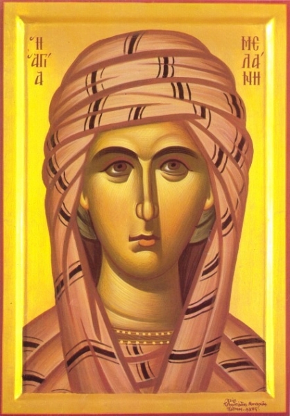Преподобная Мелания, первая из знатных римлянок "с юных лет стремившаяся ко Христу, жаждущая телесной непорочности и уязвленная Божественной любовью", родилась в христианской семье. Родители ее – люди именитые и богатые – видели в дочери наследницу и продолжательницу рода. В четырнадцать лет Мелания против своей воли была выдана замуж за знатного юношу Апиниана. С самого начала совместной жизни святая умоляла супруга жить с ней в непорочности или отпустить незапятнанной и телом и душой. Апиниан отвечал: "Когда по велению Господа мы приобретем двоих детей в наследники своему имуществу, тогда вместе отречемся от мира". Вскоре святая Мелания родила девочку, которую молодые родители посвятили Богу. Продолжая жить в супружестве, Мелания тайно носила власяницу и проводила ночи в молитвах. Вторые роды Мелании были преждевременными и мучительными. Родился мальчик, его крестили, и он сразу отошел ко Господу. Видя страдания своей супруги, блаженный Апиниан просил Бога сохранить жизнь святой Мелании и дал обет провести остаток совместной жизни в непорочности. Выздоровев, святая сняла навсегда свои шелковые одежды. Вскоре умерла их дочь. Между тем родители святых противились их желанию посвятить себя Богу. Только когда отца Мелании постигла смертельная болезнь, он просил у них прощения и напутствовал следовать избранному ими пути, прося о нем молиться. Святые тут же оставили город Рим, и для них началась новая жизнь, целиком посвященная служению Богу. Апиниану было в то время 24 года, а Мелании – 20. Они стали посещать больных, принимать странников, щедро помогать бедным. Обходили тюрьмы, места ссылок и рудники и освобождали несчастных, которые содержались там за долги. Продав имения в Италии и Испании, они щедрой рукой помогали старцам и монастырям, покупая для последних земли в Месопотамии, Сирии, Египте, Финикии и Палестине. На их средства было построено много храмов и больниц. Церкви Запада и Востока получали от них благодеяния. Когда они, покинув родину, отплыли в Африку, во время плавания началась сильная буря. Моряки говорили, что это гнев Божий, но блаженная Мелания сказала, чтобы они предали корабль воле Несущего его. Волны прибили корабль к острову, на котором стоял город, осажденный варварами. Осаждавшие требовали от жителей выкуп, грозя городу уничтожением. Святые внесли нужные деньги и тем спасли от гибели город и его жителей. Прибыв в Африку, они и там оказывали помощь всем нуждающимся. По благословению местных епископов жертвовали на церкви и монастыри. В то же время святая Мелания продолжала смирять плоть свою строгим постом, а душу утверждала непрестанным чтением Слова Божия, переписывая священные книги и раздавая неимущим. Она сама сшила власяницу и, не снимая, носила ее.