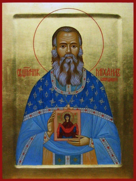 Сщмч. Михаил Богородский родился в 1878 году. Окончил Тверскую духовную семинарию, служил священником в Тверской епархии. В 1930 году арестован за «уклонение от хлебозаготовок», осуждён на год тюрьмы и 5 лет ссылки. После освобождения продолжил служение. Арестован вновь в 1937 году по обвинению в «контрреволюционной агитации». Виновным себя не признал. Приговорён к расстрелу. Казнён 17 сентября 1937 года. Причислен к лику святых на Юбилейном Архиерейском Соборе 2000 года.