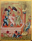 Ве́лия ве́ры исправле́ния:/ во исто́чнице пла́мене, я́ко на воде́ упокое́ния,/ святи́и трие́ о́троцы ра́довахуся,/ и проро́к Дании́л льво́м па́стырь я́ко о́вцам явля́шеся.// Тех моли́твами, Христе́ Бо́же, спаси́ ду́ши на́ша.