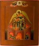 Рукопи́саннаго о́браза не поче́тше,/ но Неопи́санным Существо́м защити́вшеся, треблаже́ннии,/ в по́двизе огня́ просла́вистеся,/ среде́ же пла́мене нестерпи́маго стоя́ще, Бо́га призва́сте:/ ускори́, о Ще́дрый,/ и потщи́ся, я́ко Ми́лостив, в по́мощь на́шу,// я́ко мо́жеши хотя́й.