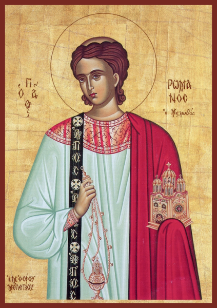 Прп. Роман Сладкопевец, византийский диакон и гимнограф, первоначально не обладал ни голосом, ни слухом. После насмешек клириков, вынудивших его петь на праздничной службе, он по молитве получил от Богородицы поэтический дар и прекрасный голос. Св. Роман стал автором более тысячи песнопений, включая знаменитый Акафист Божией Матери, и считается одним из величайших православных поэтов. Скончался около 556 года.