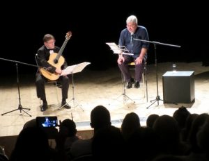 Воспринимать прозу, читаемую с листа вслух больше пяти минут, довольно непросто. Но что представит новое произведение лучше текста и как иначе погрузиться в его интонации, звучание и смыслы? Поэтому для первого прочтения глав романа автор нашел необычный и удачный формат. Евгений Водолазкин соединил чтение «Брисбена» и виртуозную тончайше-лиричную гитарную игру Михаила Радюкевича (известного в России и в мире исполнителя из Санкт-Петербурга, который преподает гитару в СпбВГИКе, является лауреатом музыкальных конкурсов всех уровней).