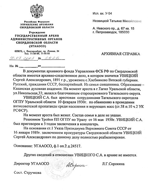 Весной 2006 года в Екатеринбургской епархии причислен к лику местночтимых новомучеников и исповедников Российских протоиерей Сергий Увицкий (отец Нины Сергеевны Пономаревой), репрессированный в 1930 году по обвинению в проведении антисоветской пропаганды, погибший 12 марта 1932 года в концлагерях Беломорканала. Так словами пророка Даниила сбылось предсказание Божие: «Пострадают некоторые и из разумных для испытания их, очищения и для убеления к последнему времени» (Дан.11:35).