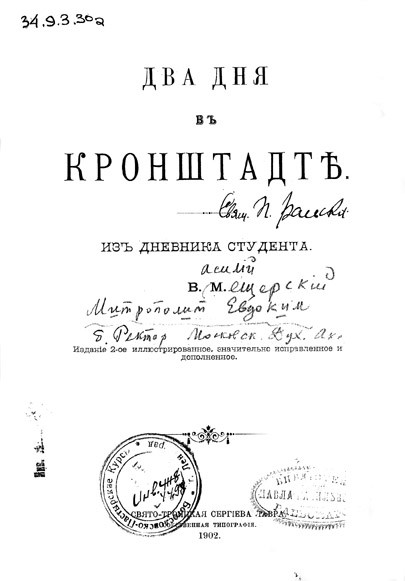 [12] Эти обстоятельства невольно подтвердились следующим фактом. На титульном листе заказанной мною в декабре 2005 года в здании Публички на Московском проспекте книги Эбергарда Деннерта «Религиозные воззрения естествоиспытателей» (Харьков, 1912 г.) я обнаружила характерную печать (в виде нарисованной обложки книги) с надписью: «Фундаментальная библиотека С-Петербургской Семинарии», рядом с которой стоял номер «10521». Поверх этой печати была поставлена другая печать, прямоугольная, в которой вписано слово «Погашено» и от руки проставлен новый номер и шифр Публички. Судя по шифру, книга поступила в библиотечный фонд в 1957 году.