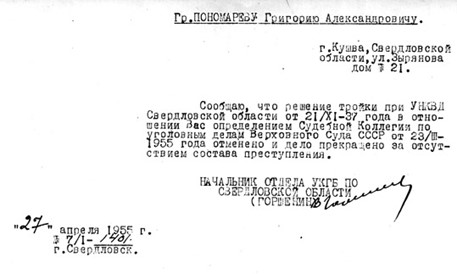 Дана священнику — настоятелю Свято-Духовской церкви города Кургана в Рябково Пономареву Григорию Александровичу, в том, что он ко дню Св. Пасхи 1963 года Его Святейшеством, Святейшим Патриархом Московским и всея Руси, по моему представительству награжден Наперсным Крестом.