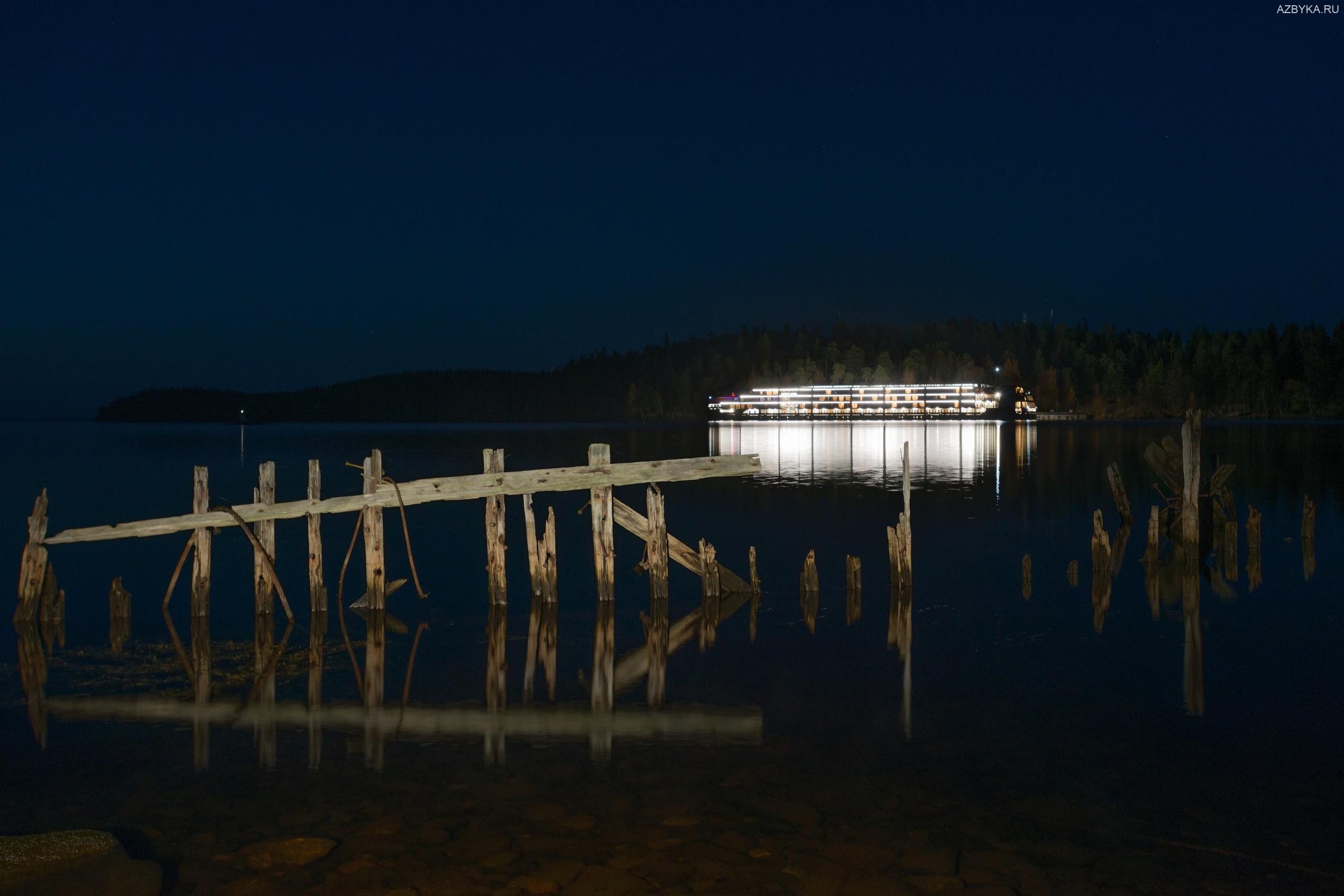 Современный теплоход последнего в сезоне рейса и остатки древней баржи на старом причале