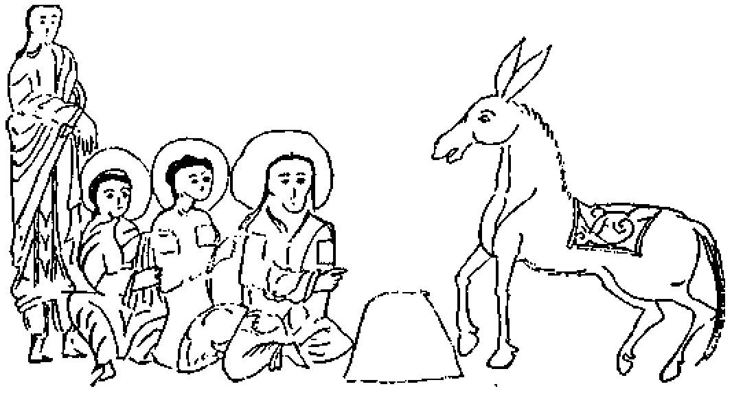 А назавтра, снабженные дорожным припасом, ушли те от них и к вечеру в тот же день другого селения достигли. Справляли там свадьбу, но из-за козней проклятого сатаны и усердия чародеев онемела тамошняя невеста и совсем бессловесной сделалась. Когда же вступила, неся Сына своего Господа Христа, в селение это Владычица Мария, протянула, увидав ее, немая невеста к Господу длани свои и на руки Его подхватила и, крепко к себе прижав, целовала, баюкала и качала, над Ним склонившись. И разомкнулись тотчас уста ее, и стали уши слышать. Воздала она Богу, ей здоровье вернувшему, хвалу и благодаренье. Жители же селения этого всю ночь от радости ликовали, решив, что сошел с небес, да прямо – к ним, Бог с ангелами своими.