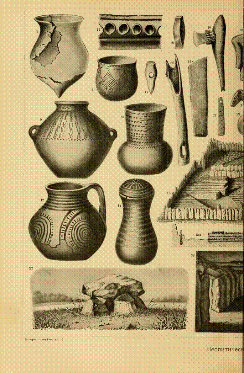 Точно также в северной Африке, Греции, на побережьях Черного моря, в Малой Азии, в древнем культурном центре Востока, в странах Евфрата, в Китае и Японии, во всем старом культурном свете находятся доказательства бывшего неолитического века. И там на этом древнем слое залегают пласты высшей культуры. Культурное достояние человека было на всем этом обширном пространстве в существенных чертах одинаково в течение развитого нового каменного века: этот век является общей основой для культуры Старого Света.