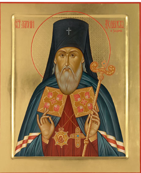 Православия наставниче, чистоты зерцало, монашескаго жития ревнителю и нищих питателю, отеческаго попечения о пастве твоей добрый образе, от юности себе смиривый и десницею Христовою в славу святых возвышенный, земли Воронежския украшение, Антоние отче наш, в трудех святительских Митрофану и Тихону поревновавый, /с нимиже в небесех ныне ликуя, молися Спасу всех даровати мир и душам нашим велию милость.