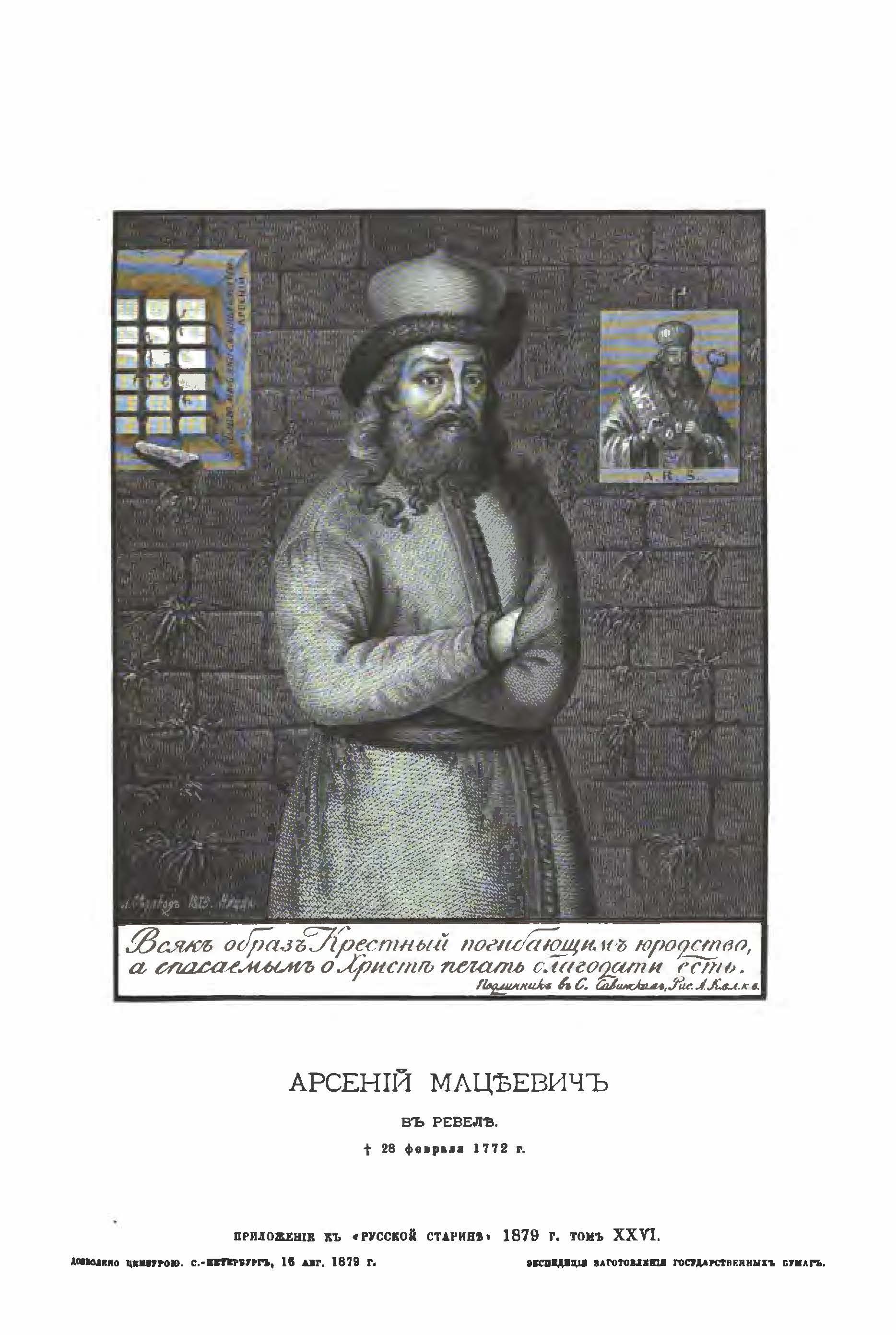 «Памятник Арсению Мацеевичу», статья М. Лонгинова, «День» 1862, № 19. Мы не считаем нужным говорить о тех, которые, в оправдание Арсения, приводят то, что сам Шешковский, почувствовав жестокость своих розысков, до самой смерти посылал в Ревель на поминовение по Арсение. «Рус. Достопамят.», 34. Гораздо интереснее сообщенное нам редакцией «Русской Старины» «письмо неизвестного» о кончине митр. Арсения, помеченное 23-м марта 1776 г. (!) и очевидно сочиненное в ХVIII-м веке, но показывающее, как трудно было известной партии примириться с совершившимся фактом. Больное место этого письма – отобрание церковных имуществ. Мы помещаем его в приложении.