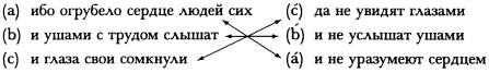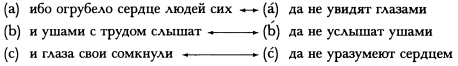 Хиазм – риторическая фигура, весьма часто используемая как в Ветхом, так и в Новом Завете. Термин этот произошел от названия греческой буквы «хи» напоминающей по форме крест св. Андрея. В этой фигуре речи две половины отрывка текста являются зеркальным отображением друг друга. Если обозначить латинскими буквами строки в первой половине, а соответствующие им строки второй половины – теми же буквами со знаками акцента, то обычная структура хиазма из четырех строк будет такой: ab–b'á, из шести строк – такой: abc–c'b'á, и т. д. Таким образом, языковой порядок второй половины хиазма противоположен порядку первой половины. Пример115 четырехстрочного хиазма можно найти в Мф 7:6:
