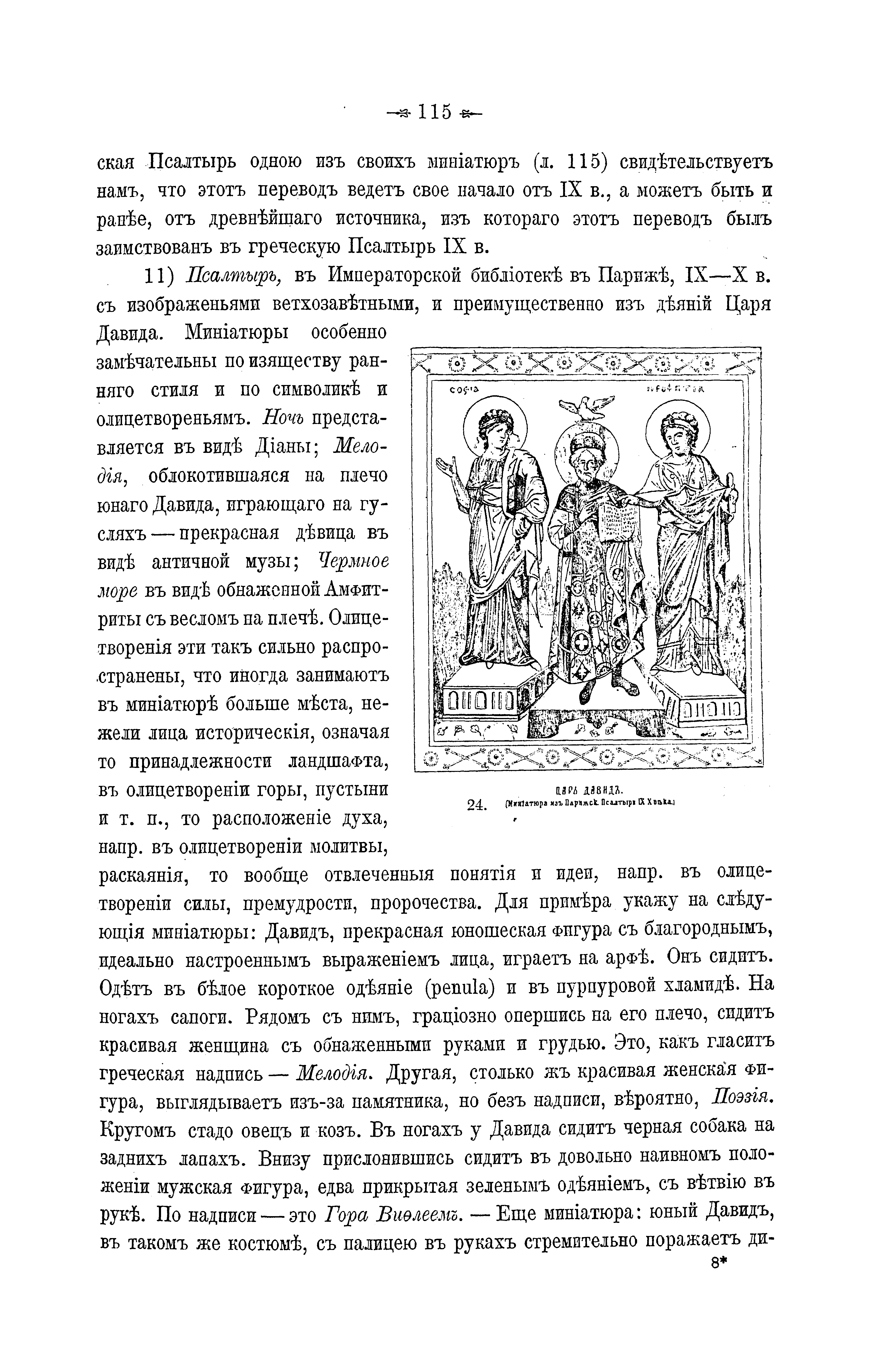 11) Псалтырь, в Императорской библиотеке в Париже, IX–X в., с изображениями ветхозаветными, и преимущественно из деяний Царя Давида. Миниатюры особенно замечательны по изяществу раннего стиля и по символике и олицетворениям. Ночь представляется в виде Дианы; Мелодия облокотившаяся на плечо юного Давида, играющего на гуслях – прекрасная девица в виде античной музы; Чермное море в виде обнаженной Амфитриты с веслом на плече. Олицетворения эти так сильно распространены, что иногда занимают в миниатюре больше места, нежели лица исторические, означая то принадлежности ландшафта, в олицетворении горы, пустыни и т. п., то расположение духа, напр. в олицетворении молитвы, раскаяния, то вообще отвлеченные понятия и идеи, напр. в олицетворении силы, премудрости, пророчества. Для примера укажу на следующие миниатюры: Давид, прекрасная юношеская фигура с благородным, идеально настроенным выражением лица, играет на арфе. Он сидит. Одет в белое короткое одеяние (penula) и в пурпуровой хламиде. На ногах сапоги. Рядом с ним, грациозно опершись на его плечо, сидит красивая женщина с обнаженными руками и грудью. Это, как гласит греческая надпись – Мелодия. Другая, столько же красивая женская фигура, выглядывает из-за памятника, но без надписи, вероятно, Поэзия. Кругом стадо овец и коз. В ногах у Давида сидит черная собака на задних лапах. Внизу прислонившись сидит в довольно наивном положении мужская фигура, едва прикрытая зеленым одеянием, с ветвью в руке. По надписи – это Гора Вифлеем. – Еще миниатюра: юный Давид, в таком же костюме, с палицею в руках стремительно поражает диких зверей. Ему помогает античная женская фигура, по надписи – это Сила. Другая фигура, высовываясь из расщелины скалы, движением руки выражает изумление, вероятно, божество Горы. В Лобковской миниатюре, снимок с которой приложен в следующей главе,– сюжеты обеих парижских миниатюр, соединены в одной картине, и олицетворения опущены. – Еще пример: миниатюра в два ряда: в верхнем посреди – Моисей, изящно драпированная юношеская фигура – выводит Израильтян из земли Египетской, означенной зданиями на заднем плане. Над зданиями парит в воздухе, только по пояс намеченная синею краскою, Диана – с развивающимся вокруг головы покрывалом. Это по надписи – Ночь, потому что бегство совершается ночью. Под этой богинею на земле сидит женская фигура, обращающаяся к небу: по надписи – Пустыня, потому что Израильтяне бегут в пустыню. В нижнем ряду фараон с войском тонут в море. Энергическая фигура, воспоминание древнего Тритона, стремительно хватает фараона за волосы: это по надписи – Бездна. Внизу олицетворение Чермного моря в виде обнаженной Амфитриты с веслом на плече. – Еще: Пророк Исаия молится, стоя между двух фигур: одна женская в виде Дианы – это Ночь, другая – маленький мальчик с факелом – это звезда Денница. Давид, с бородой, в царском одеянии стоит тоже между двух фигур: обе – красивые женщины: это Премудрость и Пророчество. Обе эти миниатюры см. в приложенных ниже рисунках 20 и 21. Некоторые олицетворения в сиянии, каковы: Молитва, Премудрость, Пророчество, Ночь; другие без сияния, например: Море, Пустыня, Бездна. – Для истории этой рукописи необходимо заметить, что миниатюры ее повторяются в других современных рукописях, как напр., Исаия с Ночью и Зарей в Ватиканском кодексе Пророка Исаия IX