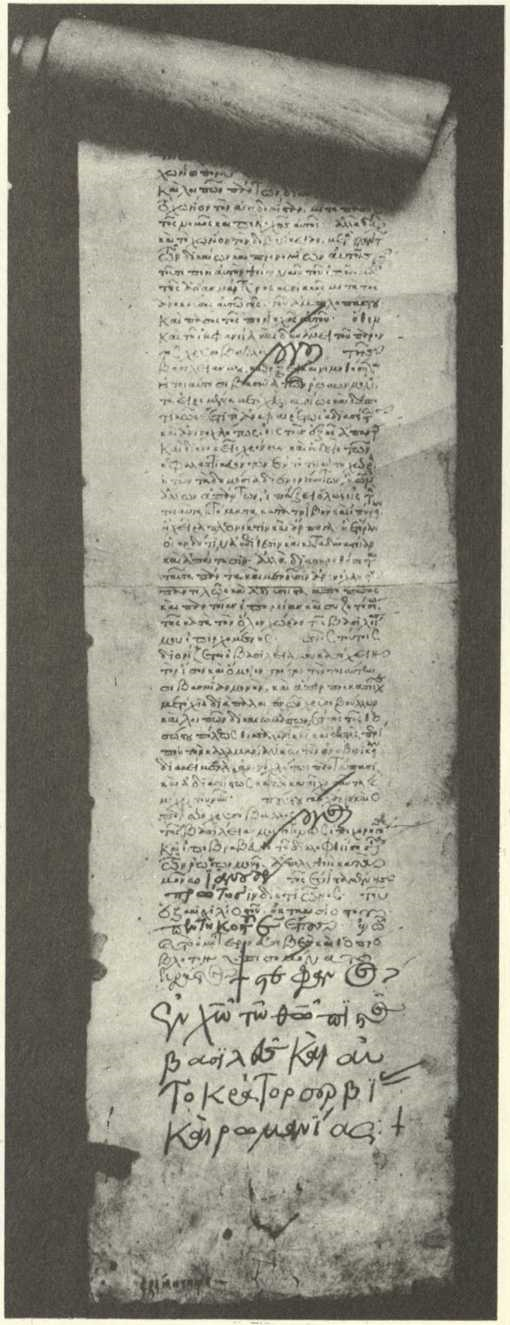 В то же время уже после выхода в свет каталога С. Ламброса собрание пополнилось 6 пергаментными кодексами XI–XIV вв. (С1–С6) и 290 рукописями XIV–XX вв., написанными на бумаге (№ 1028–10318).5 Таким образом, в настоящее время собрание греческих рукописей Пантелеймонова монастыря насчитывает 1270 кодексов (не считая большого числа рукописных отрывков, упомянутых в каталоге С. Ламброса суммарно). Из рукописей, не вошедших в печатный каталог, особо следует отметить Лицевое Евангелие тетр XI–XII вв. (№ 2). К числу ценнейших относится также бумажный кодекс № 1187, являющийся замечательным памятником славяно-византийских культурных связей эпохи средневековья. В этой греческой рукописи 1347 г., содержащей сочинения Анастасия Синаита, на чистых листах вписаны черновики (!) хрисовулов сербского правителя XIV в. Вука Бранковича. Большой интерес представляют также найденные фрагменты рукописей. Среди них есть отрывки кодекса XIII в., написанного унциальным письмом, и кодекса, созданного в X в. в знаменитом константинопольском скриптории Ефрема (определение сделано по ксерокопии Б. Л. Фонкичем).