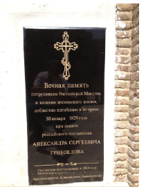В настоящее время место, где была могила, заложено тротуарными плитами. Ими выложен весь двор. Почему это произошло и что послужило причиной ликвидировать могилу не известно. Автор решил восстановить историческую могилу наших соотечественников. Но куда бы он ни обращался, в государственные или общественные структуры, автор везде встречал вежливый отказ. В конце концов, автору надоели бюрократические хитросплетения и он решил восстановить могилу за свой личный счёт. Могила восстановлена к 185-летию со дня трагической кончины сотрудников российского посольства и казаков посольского конвоя, которая произошла 30 января (11 февраля н. ст.) 1829 года.