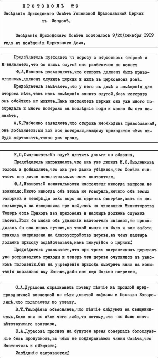К тому же все яснее становилось, что Русской Посольской церкви необходимо сменить юридический статус: оставаться храмом, приписанным к посольству несуществующей державы, было неблагоразумно. Поэтому в сентябре 1919 г. решением общего собрания прихожан Успенской церкви был учрежден Лондонский Успенский приход Православной Российской Церкви (илл. 4.1–4.3), а в качестве приходского устава был принят устав, утвержденный Всероссийским Поместным Собором 1917–18 гг. (илл. 4.4). Был избран Приходской совет и Ревизионная комиссия. Чуть позже было создано сестричество во имя прп. Ксении; первой старшей сестрой стала Великая Княгиня Ксения Александровна, младшая сестра Царя-страстотерпца Николая.