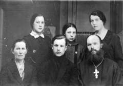 Семья отца Николая в Сахаляне. Сидят, слева направо: матушка Пелагея, Серафим, отец Николай Колчев. Стоят, слева направо: Лидия, Калерия, Евфалия.