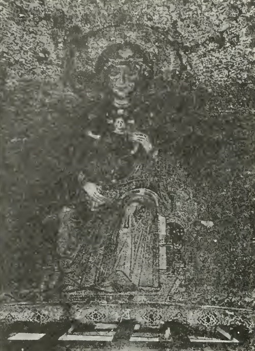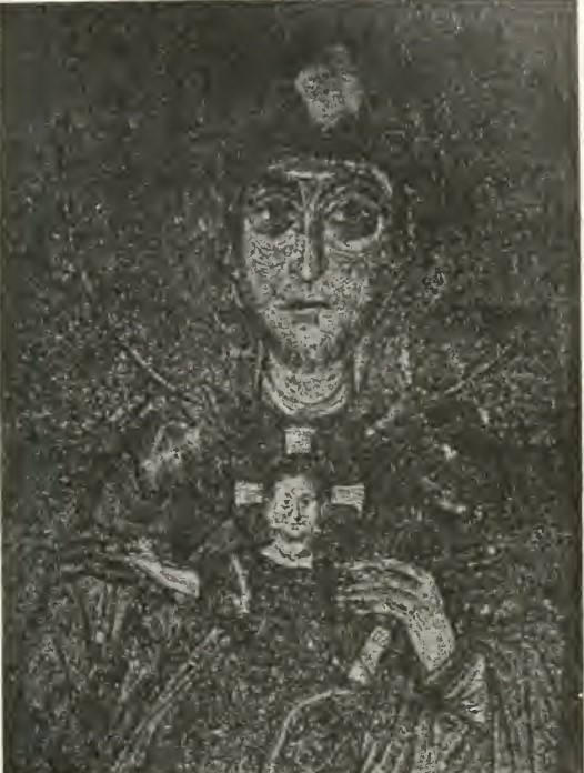 Незначительный остаток мозаического изображения Богоматери с Младенцем в абсиде Дафнийской церкви близ Афин86, относящегося, вместе со всею росписью к концу XI века, также не видоизменяет положения Младенца в более натуральной форме: Он представлен сидящим на коленах Богоматери, тогда как Мария по-прежнему касается левой рукою Его ноги.