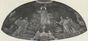В римской катакомбе свв. Петра и Марцеллина в своде капеллы, посвященной этим святым, сохранилось (рис. 15) изображение Спасителя, сидящего между верховных апостолов и четырех святых: Горгония, Петра, Марцеллина и Тибурция. Посреди святых внизу находится изображение Агнца на скале, из которой вытекают четыре реки. Поверх скалы в надписи читается имя реки Иордана , будто бы подразделившейся на эти четыре потока. Изображение это должно относиться к началу VI столетия, хотя нимб Спасителя, украшенный буквами А и еще не представляет обычного впоследствии креста, и все три главные фигуры хорошего письма, тогда как живопись VI столетия в римских катакомбах, частью заброшенных, не отличается художественными достоинствами. Спаситель представлен на широком троне; перед троном подножие. Спаситель держит на коленах книгу Евангелия; правая рука Его сложена для двуперстного благословения.