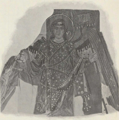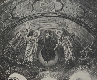 Алтарная роспись Нередицкой церкви представляет своеобразный образ «Иисуса Христа ветхого денми“ в медальоне (рис. 86), по грудь, окруженного двумя архангелами Гавриилом и Михаилом. Спаситель, Бог Слово, второе лицо Пресвятой Троицы, является здесь в типе старца, с белыми, как лунь, волосами, но в одеждах, присваиваемых Спасителю, с Его крестовым нимбом, именословным перстосложением и со свитком в левой руке. Византийское искусство, во времена иконоборства, представляло Творца в историческом лице Иисус а Христа, в замке свода алтарной арки.