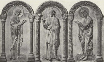 В том же характере выполнено изображение Спасителя и апостолов, почти в натуральный рост, на рельефе малоазийского происхождения, происходящем из монастыря Сулу в урочище Псаматия в Константинополе (рис. 5). Спаситель изображен в виде стройного, безбородого юноши, с длинными, вьющимися волосами, охваченными повязкой; облачен, поверх хитона, в гиматий, образующий мелкие складки, и правая рука Его сложена, внутри складок, покойно на груди, а левая опущена и слегка придерживает одежду. По сторонам Его стоящие два апостола первоначально держали в руках свиток и раскрытый диптих, во свидетельство того учения и Завета, который они получили. Образ Христа напоминает высокие типы мудрецов, но в юношеском возрасте. Крестообразный нимб требует отнести рельеф к началу пятого столетия.