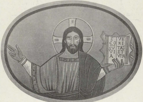 Погрудное изображение Спасителя (рис. 75) сохраняется ныне над входом в монастырь Св. Варфоломея, в Риме, находящийся на острове реки Тибра. Этот кусок мозаики остался от расписанного фасада и представляет Христа (на престоле) благословляющим и держащим Евангелие, раскрытое на словах; «Аз есмь путь, истина и живот». Спаситель облачен, поверх белого хитона, в золотую далматику с драгоценными камнями и двумя голубыми клавами. С левого плеча накинут синий гиматий, опускающийся одним концом на грудь, а другим переброшенный за спину и спереди фигуры вновь на левую руку. Крещатый нимб украшен, по голубым эмалевым рукавам креста, драгоценными камнями. Лик передает, установившийся в X веке, византийский тип: правильный, продолговатый овал, ровная и широкая форма лба, плоские дуги бровей, кроткое и благое очертание нижней части лица, густые, темно-каштановые волосы. Мозаика относится, по всей вероятности, к концу XII века.