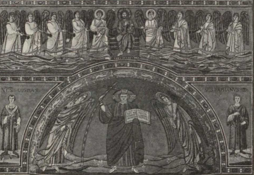 Юный Спаситель изображен в большой торжественной мозаической сцене, украшавшей некогда (ныне же в Берлинском музее) апсиду и триумфальную арку Равеннской церкви во имя Св. Архангела Михаила и относящейся к 530–549 гг. (рис. 10 и 10а) В этой равеннской мозаике воспроизведен обычный сюжет римских композиций: на триумфальной арке изображен Спаситель, как Судия мира, восседающим на престоле, среди архангелов, «трубными гласами» возвещающих Второе Пришествие. Такого рода апокалипсические сюжеты были распространены по преимуществу в IV и V столетиях, и вместо самого Спаса Вседержителя тогда изображался «Уготованный престол Его», как образ ожидаемого Второго Пришествия. Но в этой равеннской мозаике появляется новый сюжет: Юный Спаситель, стоя, держит монументальный драгоценный крест и Евангелие, раскрытое на словах: «Видевый Мене виде Отца» (Ин. 14:9): «Аз и Отец едино есма» (Ин.10:30). По сторонам Спасителя стоят архангелы Гавриил и Михаил; почва покрыта цветами, прообразуя обетованный рай. Таким образом, здесь представлены слава воскресшего Спасителя или Спаса Вседержителя и в то же время древнейший образ «Спаса Эммануила». Рядом, на триумфальной арке, Спаситель является в историческом типе, как судия мира и как «Сын человеческий», каким Его видели на земле; по сторонам Его восемь ангелов, среди облаков, созывают трубным звуком на Страшный Суд.