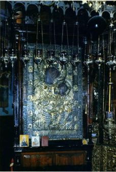 Святая икона находится в большом дубовом киоте, инкрустированном перламутром. Как обычно бывает в греческих храмах, верующие прикладываются к ее небольшой копии, расположенной перед самим чтимым образом.