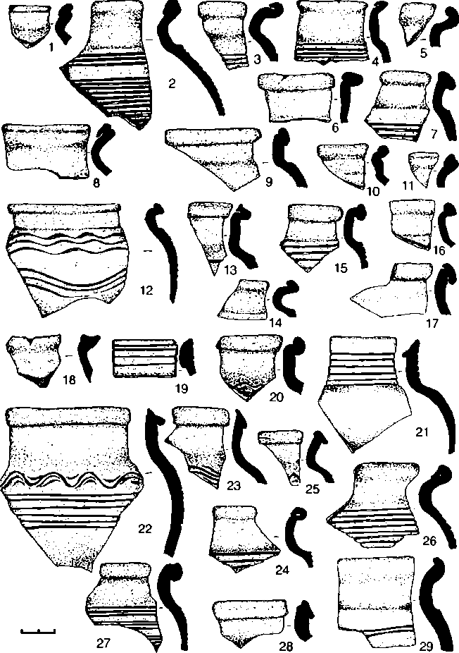 В материалах поселений исследуемого микрорегиона такая керамика составляет 36 % от общего числа, при этом абсолютно преобладает тип 11: его доля в общей выборке – 28 %.