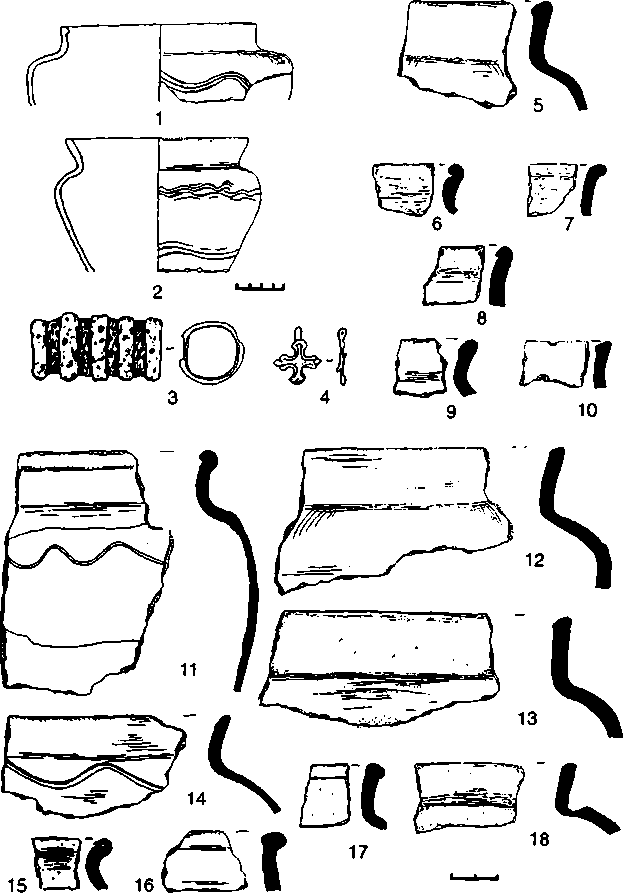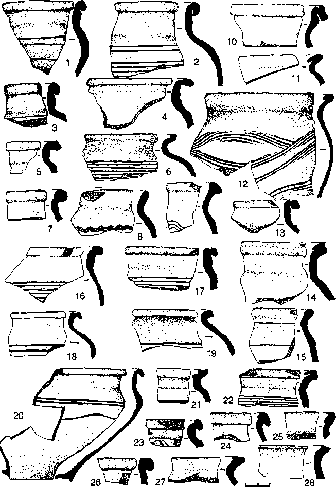 Особенности наиболее поздних подтипов керамики «курганного типа» (8 Г и 8 Д) дали две линии развития в керамике XIII–XIV вв. Одна из них выразилась в уменьшении профилированности венчика (развитие подтипа 8 Г – тип 11), другая – в уменьшении и исчезновении устья – верхней отогнутой части венчика (развитие подтипа 8 Д – типы 9 и 10).
