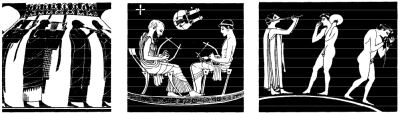 В центре: урок Лина (по краснофигурному скифосу художника Пистокоена, 475 до н. э.).