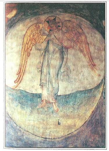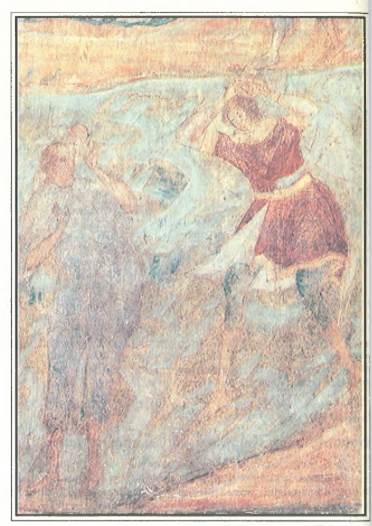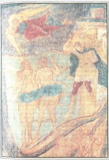Вначале рассказывается о том, как Ангел Великого Совета создал Землю, украсил ее травами и деревьями, населил птицами и рыбами, и приготовил мир к созданию лучшего, наиболее совершенного своего творения ― человека100. Но человек не оправдал надежд творца и был изгнан из рая. Провинность Адама усугубили преступления Каина, и разврат «сынов и дочерей Каиновых». «Природа человеческая греховна», ― утверждает мастер, и заканчивает повествование сценами Всемирного потопа, во время которого гибнут первые «насельники» Земли. Но рядом с этой темой неумолимого возмездия за грехи и провинности людские, в росписи звучит и другая ― оптимистическая тема грядущего искупления и торжества справедливости101. Автор верит, что «горести людей ― всего лишь преходящие испытания», и стремится «исполнить уверенности в собственных силах, пробудить в них надежды на светлое будущее, внушить веру в разумное начало»102. Вот почему Ламех убивает Каина, а семейство Ноя, спасшееся во время Потопа, благодарит Творца, возродившего мир к новой жизни.