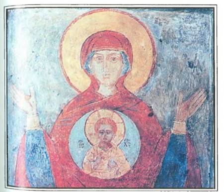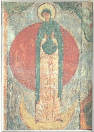 «В сказании об образе Софии Премудрости Божией «Премудрость» аллегорически представляется Богоматерью, чему дается объяснение: «Образ Премудрости Божией Софии проявляет собою Пресвятыя Богородицы неизглаголаннаго девства чистоту. Имать же девство лице девиче огненно, и над ушима тороцы, и венец царский на главе и над главою имеет Христа и на высоте простерты небеса» (Кондаков Н.П. Лицевой иконописный подлинник. С. 75). Отождествление понятий Богоматери и земной церкви произошло очень рано и нашло законченное выражение в системе росписей византийских и русских храмов Х‒ХII вв., в центральной апсиде которых обычно изображалась Богоматерь Оранта в позе моления перед Христом Пантократором. «В данном случае она (Богоматерь) олицетворяет церковь Земную» (Лазарев В.Н. История византийской живописи. С. 339‒390).