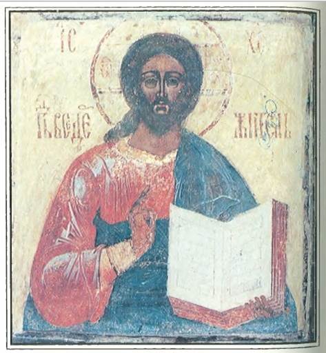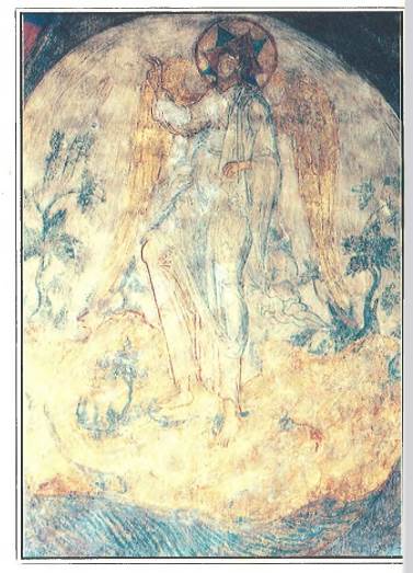Храм посвящен Воскресению Иисуса Христа. Поэтому тематика, связанная с деятельностью Бога Сына, рассказ о Его пришествии в мир и о великой искупительной миссии должны были занять видное место в системе росписей церкви. Уже в сценах Творения мира, в южной галерее, наряду с Богом Отцом, активное участие принимает Бог Сын в Его божественном облике Ангела Великого Совета17. В сценах из «Апокалипсиса», в западной галерее, Он отождествлен с «Сидящим на престоле». Так в композиции, иллюстрирующей 1-ю главу «Откровения Иоанна Богослова» (в северном люнете) мы видим облаченного в золотые одежды Христа, по воле и слову которого низвергаются и гибнут города, происходят мировые катаклизмы.