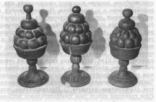 О форме сосуда для миропомазания в тексте Чина не упоминается. Сказано только, что миро было принесено на золотом блюде89. В библейском описании пророк Самуил помазывает Саула из «сосуда с елеем» (1Цар.10:1), а при помазании Давида и Соломона используется рог (1Цар.16:13; 3Цар.1:39). Кубки с крышками буклированной формы, подобные изображенным на Царском месте, привозились в Москву из Европы в составе посольских даров. По замечанию Г.А. Марковой, на Руси в XVI в. кубки имели особое значение в качестве наиболее ценного царского «жалования» или вклада, что зафиксировано и в документах. Их изображения появляются на миниатюрах русских исторических рукописей: подобные буклированные кубки можно видеть на некоторых миниатюрах Лицевого летописного свода90. Г.А. Маркова отмечает также, что сосуды с Царского места – первый и единственный пример кубков русской работы по западному образцу, изготовленных в Москве в XVI в.91