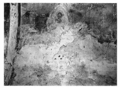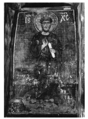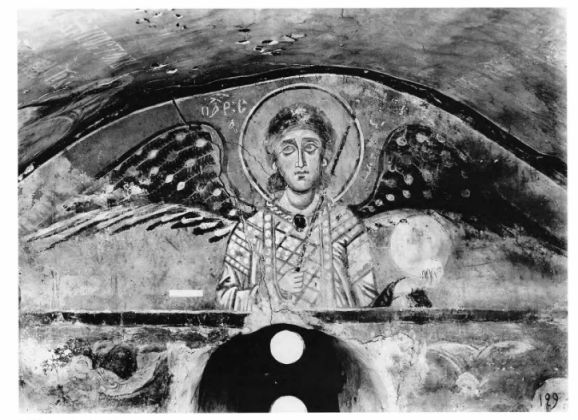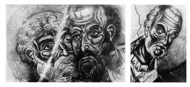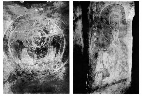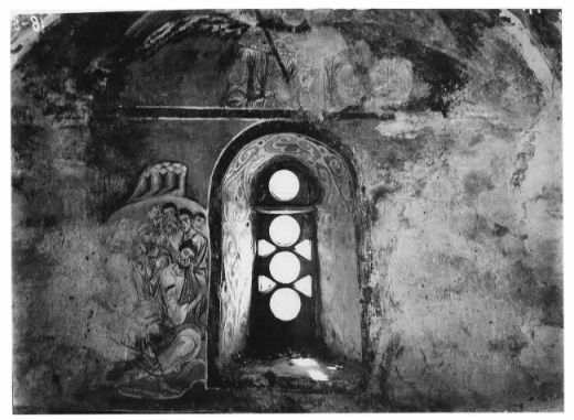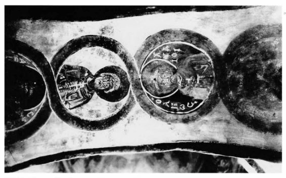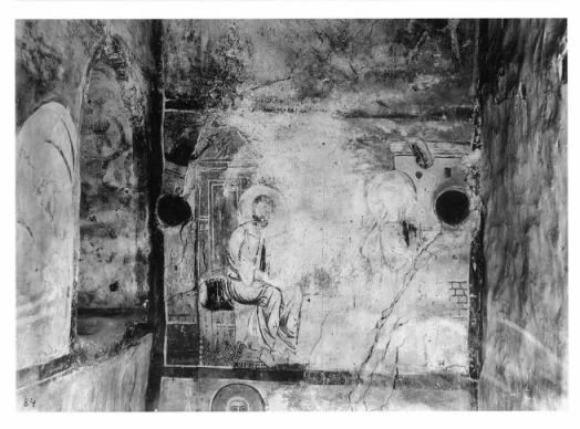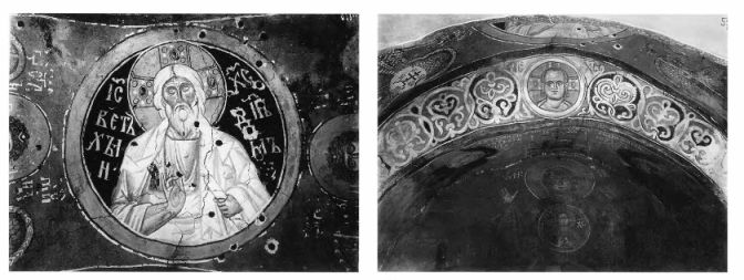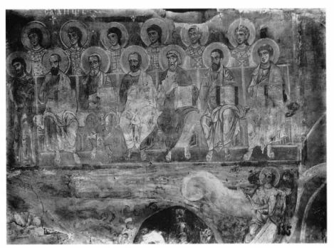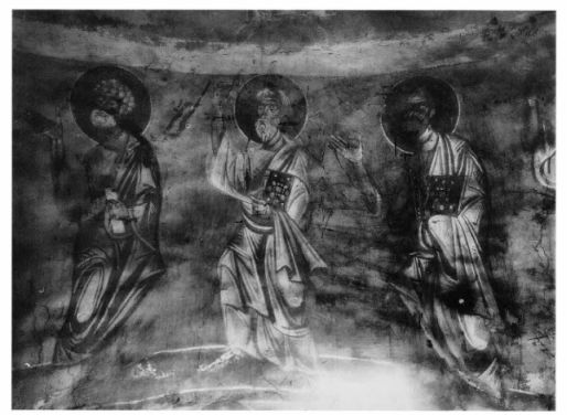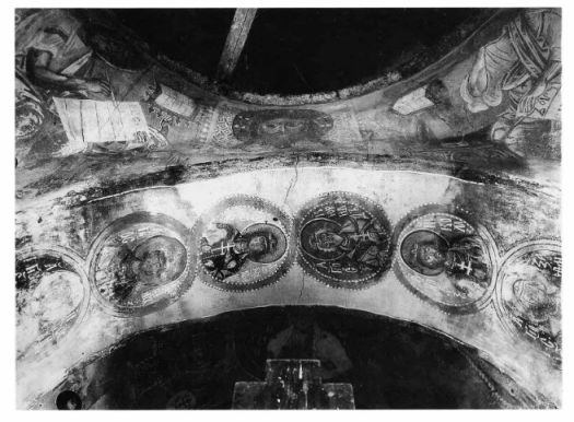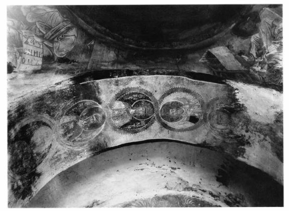 На своде алтаря две вереницы трехчетвертных епископов с развернутыми свитками приближаются к конхе, в которой изображен Христос во славе на мандорле, из-под которой выступают поясные символы евангелистов в сегментах. Эта композиция уникальна в византийской и древнерусской живописи. Происхождение ее представляет собой исключительный интерес, оно идет от очень ранних IX, X веков сирийских композиций. Путь ее проникновения в новгородскую живопись прослеживается. В VII веке при нашествии арабов на Сирию и Палестину и в VIII‒IX веках в эпоху иконоборчества сирийские монахи, в том числе и мастера живописи, бежали на Восток и на Запад. На Востоке они оказали сильнейшее влияние на живопись бесчисленных пещерных церквей пещерных монастырей Каппадокии IX‒X веков. Во всех алтарных конхах изображалась композиция Христа во славе в окружении поясных символов евангелистов в сегментах; там она осложнялась добавлением по сторонам серафимов, тетраморфов и тронов ― огненных колес в различных вариантах. Я привожу только несколько примеров: церковь Святых апостолов X века, капелла № 3 в Тереме X века, Тавшанли килиссе (913‒920), близ Синасоса, церковь Святой Варвары в Соганле (1006‒1020)112.