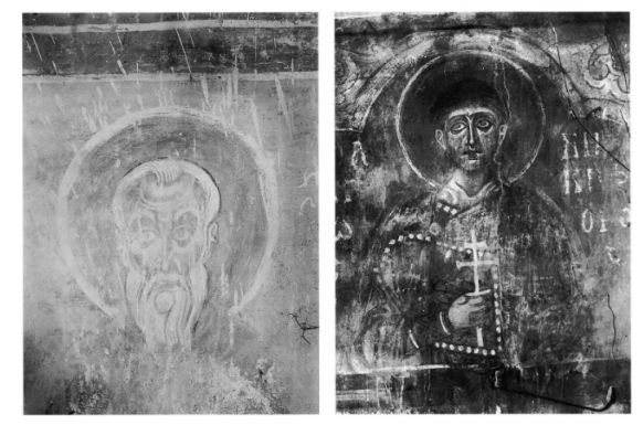 М.И. Артамонов имеет здесь в виду первую манеру его классификации, у меня она вторая. Особо интересно то, что эта манера самая самобытная, не имеющая каких-либо византийских черт, и именно в ней встречаются имена с русскими окончаниями. Относительно второй манеры его классификации ― первой у меня ― он пишет: «Надписи всех этих изображений сходны между собой и, как было указано выше, тем же почерком исполнены надписи у нижнего ряда святителей на южной стене алтаря первого стиля»123, то есть второго стиля моей классификации. Относительно третьей манеры (у меня тоже третьей) М.И. Артамонов пишет: «Ближайшее сходство перечисленных изображений третьего стиля, сопровождающихся надписями с одинаковыми начертаниями букв, воспроизводящих явно греческое произношение имен...», а ведь как раз эту манеру я характеризую как византизирующую.