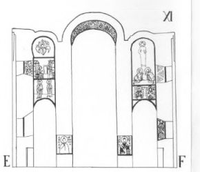 Как видно из вышеописанного, все построение многофигурных композиций, занимающих первый, четвертый и пятый регистр, рациональное, симметричное и монументальное, ограничивает каждый регистр горизонтальное обрамление, а высота каждого регистра зависит от расположения и высоты окон, окруженных обрамлениями, сливающимися внизу с общим горизонтальным обрамлением регистра. Многофигурные композиции не чередуются произвольно с единоличными изображениями, а занимают целиком регистры