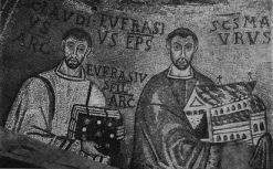 Епископ Евфрасий и архидиакон Клавдий. Мозаика апсиды базилики в Паренцо. Около 550 года