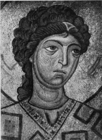 Затронутая здесь группа мозаик помогает уточнить время исполнения мозаики Софии Константинопольской, украшающей люнет южного вестибюля («Богоматерь с младенцем между императором Константином и императором Юстинианом», см. ниже). Уиттимор относил ее к 986–994 годам364. С этим не согласились А.Н. Грабар365, Вейганд366 и Галасси367, которые склонны были отодвинуть дату ее возникновения в XI век (Галасси даже думал о XII веке). Такая тенденция датировать мозаику попозже была обусловлена линейной стилизацией лиц Константина и Юстиниана. Как мы видели, подобная стилизация встречается уже в миниатюрах конца X века и во всех мозаиках первой половины XI века. Поэтому и нет решительно никаких оснований менять верную датировку Уиттимора на более позднюю368. То, что мы находим в разделке лиц обоих императоров, несомненно сложилось на константинопольской почве как особый художественный прием не позднее последней четверти X века.