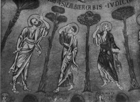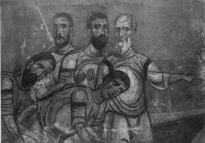 Апостолы из сцены «Чудесный улов рыбы». Фреска собора Спасо-Мирожского монастыря в Пскове. Около 1156 года
