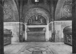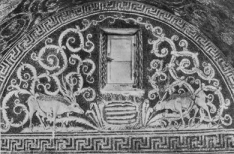 Центральное место в росписи Мавзолея Галлы Плацидии занимает крест, украшающий купол. Он дан здесь как символ победы Христа над смертью и как символ его мучений. Его окружают звезды и четыре символа евангелистов, ему поклоняются представленные над арками и в арках апостолы, как бы навстречу ему шествует св. Лаврентий (см ниже), готовый ради Христа на мученичество: виднеющийся в его правой руке крест и изображенный слева шкафчик с лежащими на его полках четырьмя евангелиями намекают на то, что он принял мученичество, подражая Христу и полностью усвоив его учение (в этой связи А.Н. Грабар правильно ссылается на слова св. Киприана: «evangelium Christi unde martyres fiunt»104). Вся эта сложная символика восходит к декорациям мартириев с их разветвленным заупокойным культом. С последним связаны и такие изображения, как пьющие из чаши голуби и тянущиеся к небольшому озеру олени (см. ниже), символизирующие алчущие бога души. Наконец, буколическая сцена с Добрым Пастырем среди стада овец (см. ниже), размещенная в люнете над входом, также навеяна заупокойным культом, иначе она не встречалась бы так часто в катакомбах105. Но на мозаике Христос из скромного эфебообразного юноши превратился в царя небесного, подобно императору восседающего в величественной позе: он опирается о золотой крест, на нем золотой хитон с голубыми клавами, поверх колен наброшен пурпурового цвета плащ. В этом образе ясно видно, как бесхитростная пастушеская буколика раннехристианской живописи уступила место под воздействием дворцового церемониала приподнятой, уже во многом византийской по своему духу торжественности.